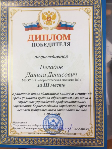 • Негадов Д.,10 кл - 3 место в конкурсе сочинений