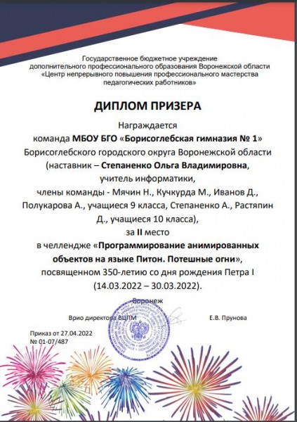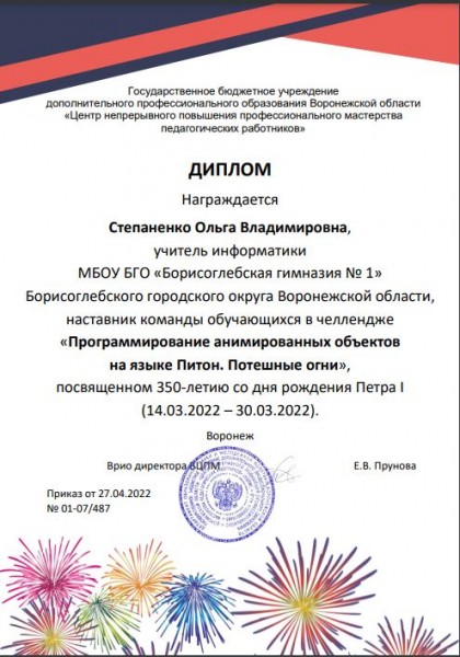 Подведены итоги регионального челленджа "Программирование анимированных объектов на языке Питон. Потешные огни", посвященного 350-летию со дня рождения Петра I (14.03.2022 – 30.03.2022) и проведенного лабораторией развития профессионального мастерства педагогов ВЦПМ в рамках Цикла региональных мероприятий "Петровские Ассамблеи".