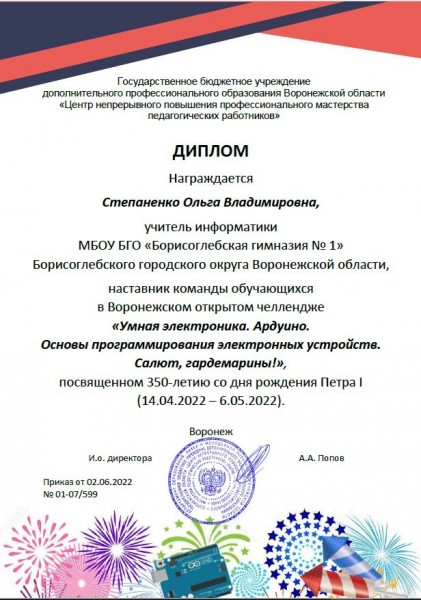 Подведены итоги регионального челленджа "Умная электроника. Ардуино. Основы программирования электронных устройств. Салют, гардемарины!", посвященного 350-летию со дня рождения Петра I (14.04-06.05.2022) и проведенного лабораторией развития профессионального мастерства педагогов ВЦПМ в рамках Цикла региональных мероприятий "Петровские Ассамблеи".