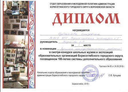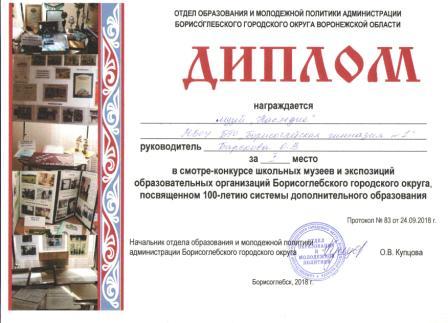 Подведены итоги очередного смотра-конкурса школьных музеев, посвященного 100-летию системы дополнительного образования. Надо отметить, что историко-краеведческий музей МБОУ БГО «Борисоглебская гимназия №1» «Наследие» (руководитель Барскова О.В., учитель истории) последние пять лет (с 2013 года) традиционно занимает в подобных смотрах первое место. И в этом конкурсе музей стал ПОБЕДИТЕЛЕМ, получив призовые места во всех заявленных номинациях.