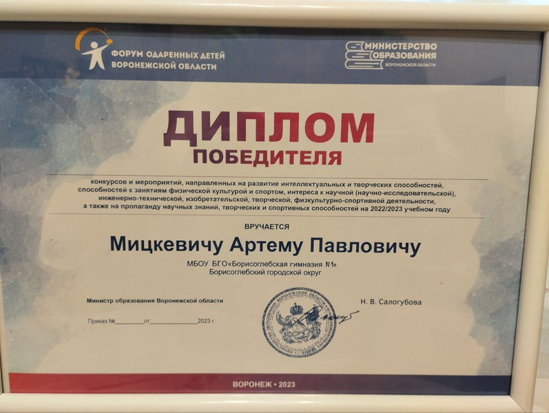 Дипломом победителя и премией правительства Воронежской области был награжден выпускник 2023 г. МБОУ БГО "Борисоглебская гимназия №1" Мицкевич Артем, победитель регионального этапа ВСОШ по технологии 2022-2023 уч.года (руководитель Степаненко О.В., учитель информатики), сейчас - студент 1 курса МГТУ им. Баумана.