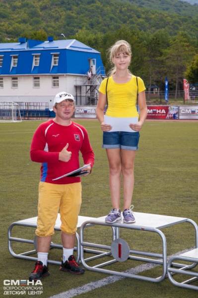 Так Степаненко Алиса заняла 1 место в отжиманиях от пола и 1 место  в прыжках в длину с места в соревнованиях по легкой атлетике среди девочек (10-13 лет) в рамках Спартакиады «RIO-Смена», проходившей во Всероссийском детском центре «Смена» с 13 по 21 августа 2016 года.