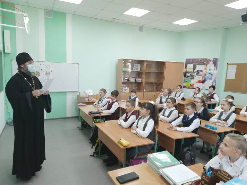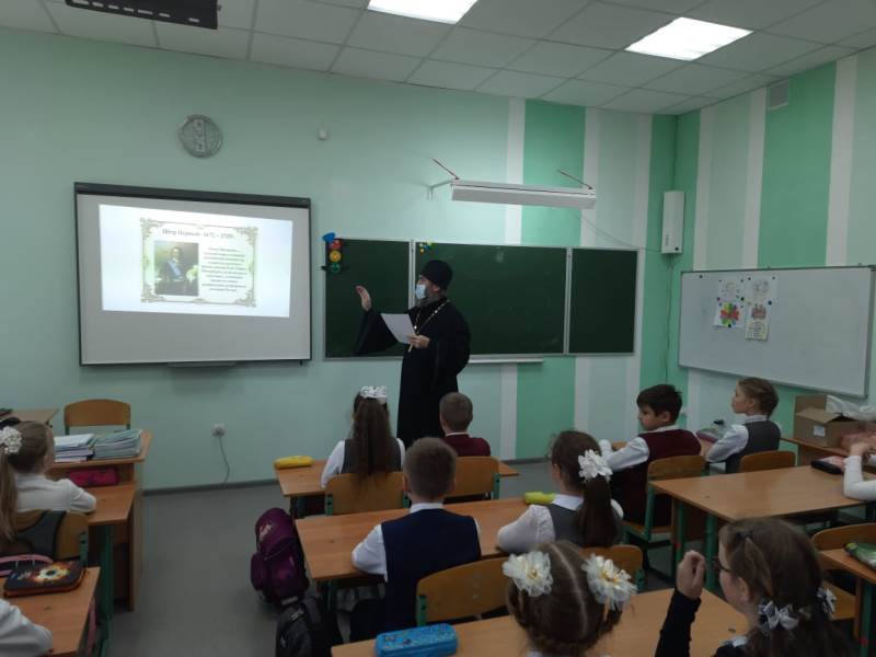 13 сентября 2021  г. состоялась встреча настоятеля храма отца Александра с учащимися 4 класса. Для беседы была выбрана тема: «Красота Божьего мира»: 350 лет со дня рождения Петра I». Отец Александр, как неординарный и творческий человек, так построил свой разговор с детьми, что они с первых минут активно включились в обсуждение, проявляя живой интерес к теме.