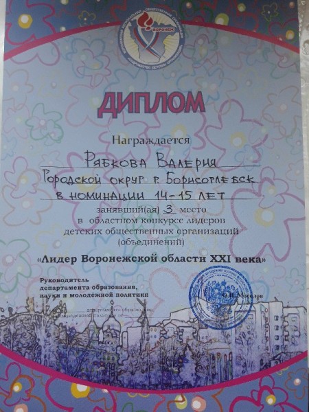 В финале Областного конкурса лидеров детских общественных объединений «Лидер Воронежской области XXI века» г. Борисоглебск представляла Рябкова Валерия, активист ДЮОО «Республика Добра» БГО.