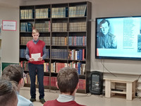Гимназистам рассказали о судьбе и творчестве поэтов и писателей-фронтовиков: В.П. Некрасова, В.Л. Кондратьева, Ю.В. Друниной, Б. Окуджавы. Читали отрывки из их произведений.