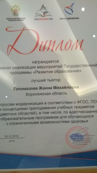 Воронежскую область на этом Всероссийском мероприятии представляла Голомазова Ж.М., учитель истории, обществознания и экономики и была награждена Дипломом как лучший тьютор по итогам 2018 года.