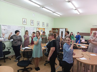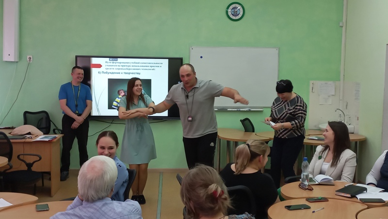 10 апреля 2024 года представители МО учителей художественно-прикладного и здоровьесберегающего цикла провели мастер-класс «Формирование учебной самостоятельности обучающихся с применением приёмов и средств здоровьесберегающих технологий», на котором были представлены разнообразные приемы здоровьесберегающей технологии. Александр Юрьевич Волхов и Роман Андреевич Котык рассказали о физкультминутках и динамических паузах, которые можно применять как на уроках физкультуры, так и на других уроках, изменяя сценарий под конкретный предмет. Игорь Владимирович Коломоец привёл пример танцевальной физкульминутки с пропеванием слов (на английском и русском языках), которая в большей степени подойдёт для начальной школы. Татьяна Александровна Мурадова поделилась с коллегами физкультминуткой, которая направлена на расслабление рук после долгого письма.