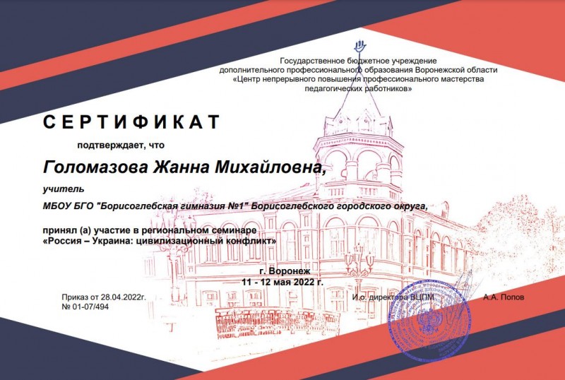 11 - 12 мая 2022 года Голомазова Ж.М., учитель истории, обществознания и экономики приняла участие в двухдневном региональном семинаре "Россия - Украина: цивилизационный конфликт".