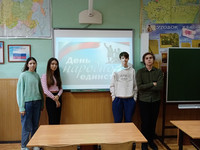 2 ноября 2023 г., когда за окном было пасмурно и время от времени моросил мелкий дождь, обучающиеся 10 класса  (классный руководитель Золотухина Е.И.) собрались в тёплом кабинете на мероприятии, посвященном Дню народного единства. Поделившись на две команды, гимназисты стали участниками викторины "Мы едины!". Викторина состояла из вопросов, посвященных государственному празднику, и конкурсов: "Знатоки истории", "Точка зрения", "Помним и гордимся". Десятиклассники активно отвечали на вопросы, вспоминали историю нашего государства, говорили о важности национального единства. После бурных обсуждений команда мальчиков одержала победу. Всё-таки сила, боевой дух и отважность - это больше мужские качества, и, наверное, поэтому вопросы, связанные с ними, легче дались именно мужской половине класса! После викторины ребята посмотрели небольшой видеоролик "Дружба народов", который рассказал о периодах русской истории, когда понятие "народное единство" приобрело наиболее актуальное значение. Завершилось мероприятие анализом строк из стихотворения Андрея Дементьева: