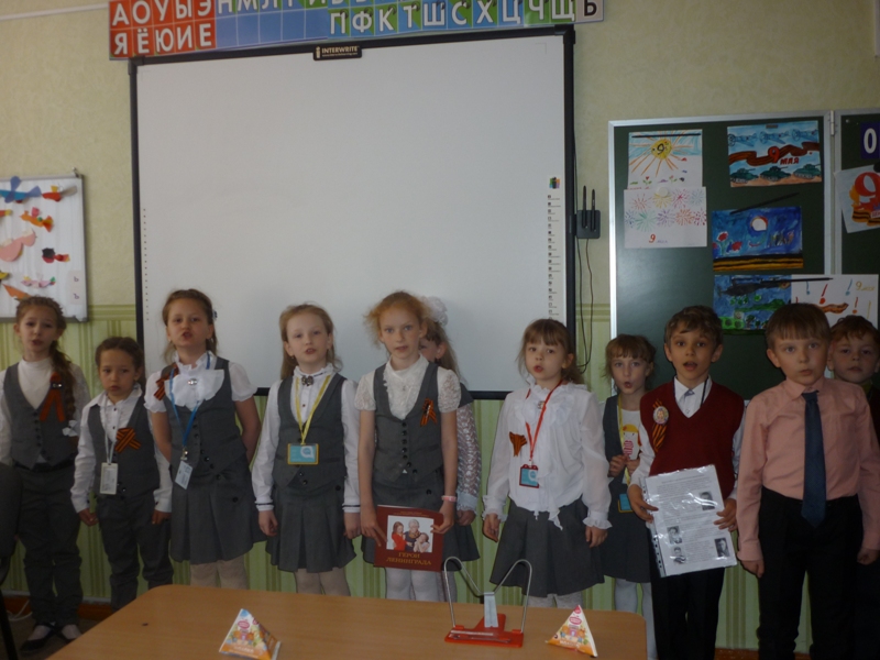 Накануне Дня Победы в 1»Б» классе весь учебный день 5 мая был посвящен событиям Великой Отечественной войны 1941-45 гг. Ребята пришли в парадной форме с георгиевскими ленточками. Сначала посмотрели презентацию  о Дне Победы и поделились своими мыслями о том, что означает этот великий праздник для каждого русского человека.  Из текста песни «Прадедушка» на уроке русского языка выписали слова: