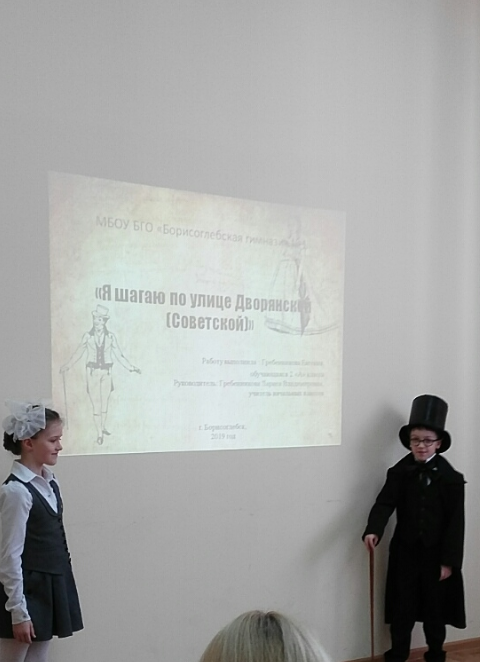 Конкурсная работа представляла собой презентацию по теме выбранной номинации. «Борисоглебскую гимназию№1» на конкурсе представляли: ученики 3 «Б» класса Жданкин Федор с работой по теме «Звезда советского кинематографа – Н.Н.Рыбников» и Окунев Михаил с работой «Люди в истории города. Владимир Вишневецкий», а также Гребенникова Евгения и Мельгунов Иван, обучающиеся 2 «А» класса, подготовившие виртуальную экскурсию «Я шагаю по улице Дворянской (Советской)». Руководила работой обучающихся учитель начальных классов Гребенникова Лариса Владимировна.