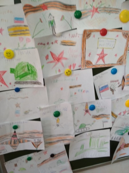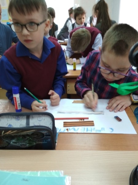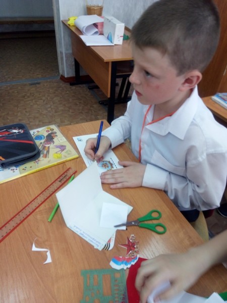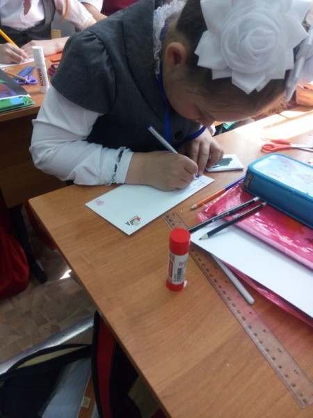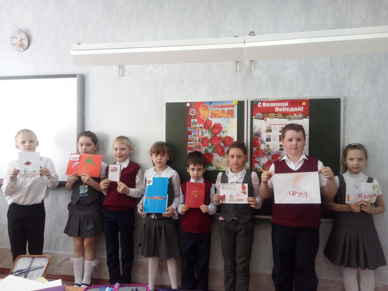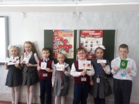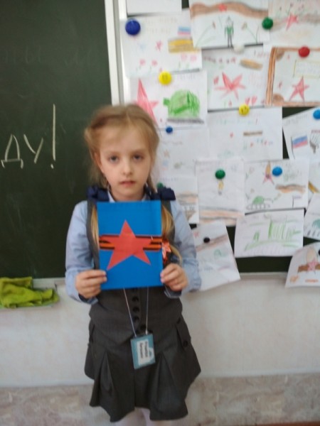 Ученики  1 "А"  и 2 "А" классов приняли участие в акции «Открытка Ветерану». Дети с особым старанием изготовили своими руками красивые открытки, написав в них тёплые слова благодарности за счастливое детство и мирное небо над головой. Письма и открытки дети вручили ветеранам 9 Мая на Торжественном митинге на площади им. Ленина.