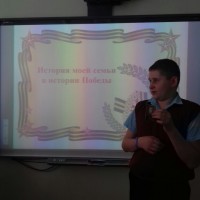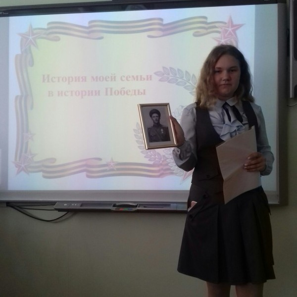 7 мая, в преддверии Дня Победы, в 8 «Б» классе прошёл классный час на тему «История моей семьи в истории Победы». Восьмиклассники рассказали о своих родственниках – участниках Великой Отечественной войны. Так, Кургузов Максим рассказал о своём прадедушке Рогачёве Викторе Владимировиче, Стахова Аня – о прадедушке Гридневе Василии Васильевиче, Жданкина Лера – о прадедушке Жданкине Фёдоре Ивановиче, Косинова Диана – о прадедушке Косинове Поликарпе Лукьяновиче, Смыслова Оля – о прадедушке Смыслове Викторе Ивановиче, Бурцева Алёна – о прадедушке Бурцеве Дмитрии Михайловиче.