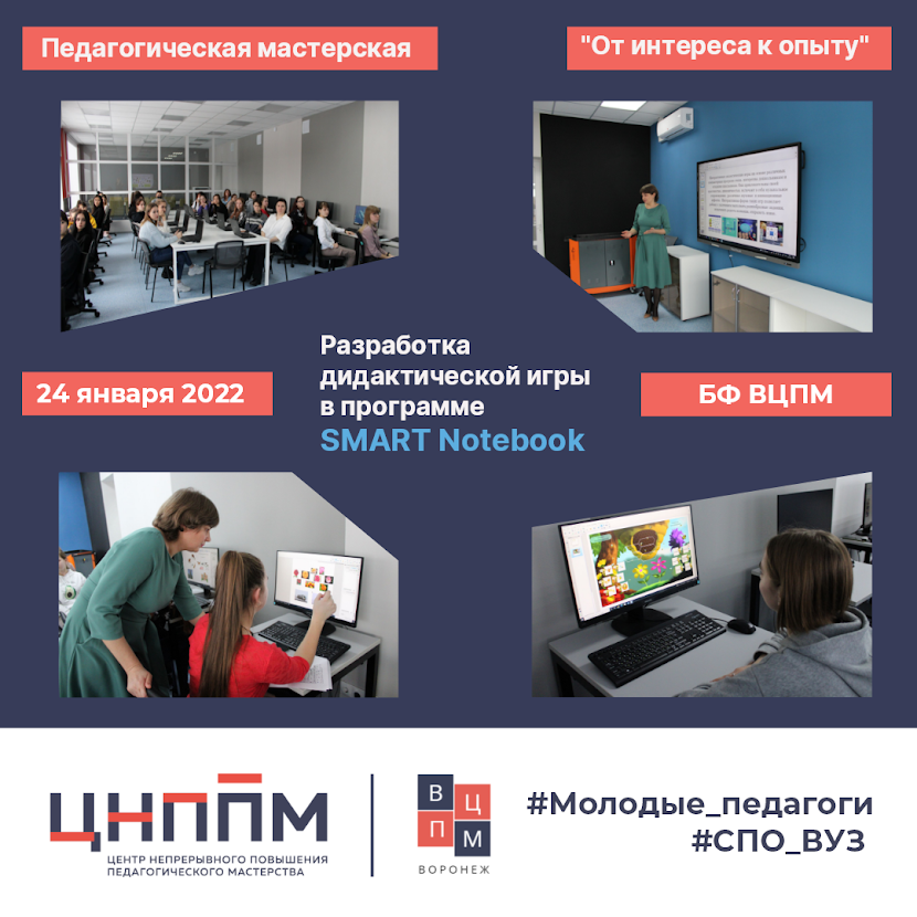 24.01.2022 г. в Борисоглебском филиале ВЦПМ состоялась педагогическая мастерская «От интереса к опыту» для молодых педагогов образовательных организаций и их наставников, студентов педагогической направленности СПО и ВУЗов.