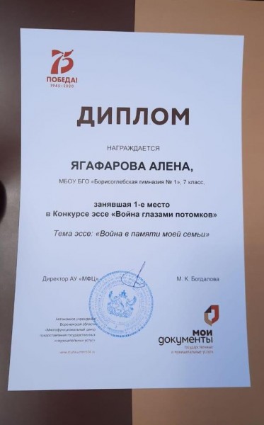 Победителем конкурса в разрезе муниципального образования Борисоглебский городской округ по результатам интерактивного голосования стала работа семиклассницы Ягафаровой Алёны "Война в памяти моей семьи".