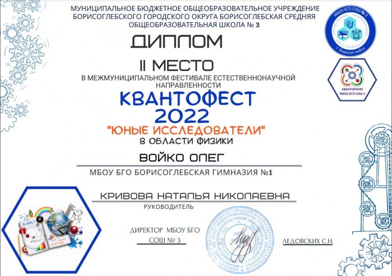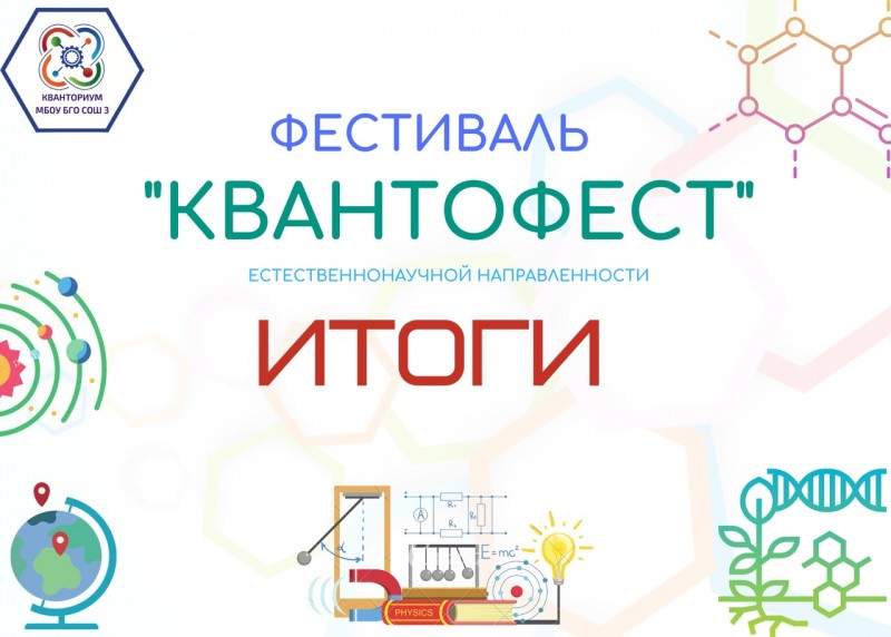 С 29 ноября по 23 декабря 2022 г. в ДТ "Кванториум" МБОУ БГО СОШ №3 состоялся межмуниципальный фестиваль естественнонаучной направленности "Квантофест". Были представлены работы по экологии, химии, ботанике, физике, географии, а также компьютерной графике.