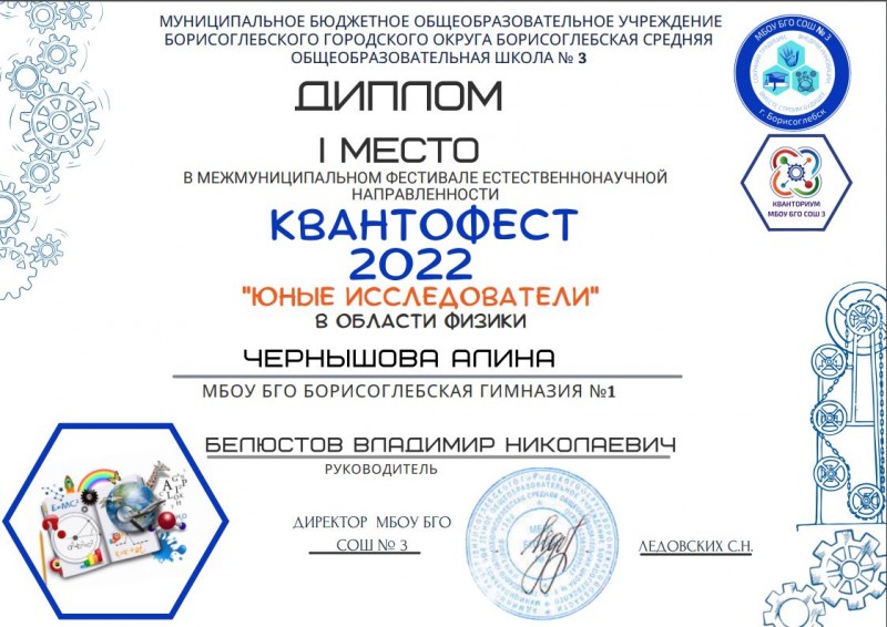 • 1 место - Чернышова Алина, 9 "А" класс (руководитель Белюстов В.Н., учитель физики)
