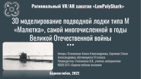 P.S. Содержанием конкурсного задания являлась работа по трёхмерному моделированию объектов и последующим рендерингом проекта. Кейс включал в себя скетчинг, моделирование, текстурирование, настройку света и рендеринг. Тема: «Оружие времён Великой Отечественной войны (от сапёрской лопаты до танка и «Катюши»)». Итоговая работа должна была содержать концепт набросок на бумаге и состоять из 3D модели (до 50000 полигонов) и презентации. Команда "Robotics" выполнила 3D моделирование подводной лодки типа М «Малютка», самой многочисленной в годы Великой Отечественной войны.