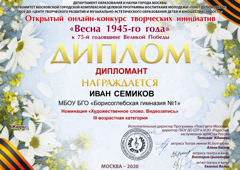 20 мая 2020 г. подведены итоги Открытого онлайн-конкурса творческих инициатив «ВЕСНА 1945-го ГОДА», посвященного 75-летию Победы советского народа в Великой Отечественной войне.