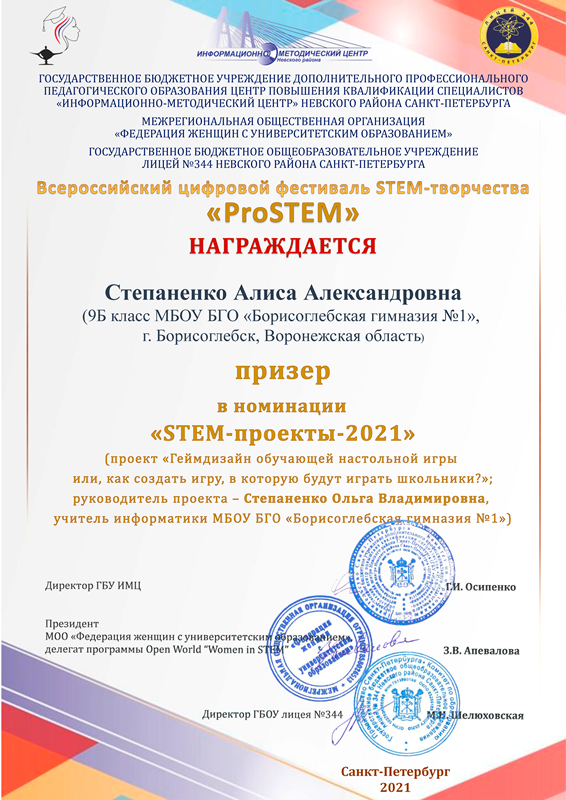 • Призер – Степаненко Алиса (9 «Б» класс). Геймдизайн обучающей настольной игры, или Как создать игру, в которую будут играть школьники? (МБОУ БГО «Борисоглебская гимназия № 1», г. Борисоглебск, Воронежская область, руководитель Степаненко О.В.).