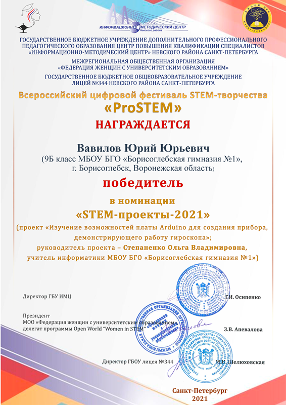 • Победитель – Вавилов Юрий (11 класс). Изучение возможности платы Arduino для создания прибора, демонстрирующего работу гироскопа (МБОУ БГО «Борисоглебская гимназия № 1», г. Борисоглебск, Воронежская область, руководитель Степаненко О.В.).