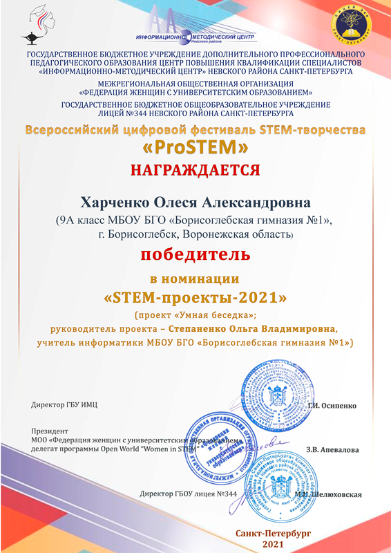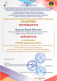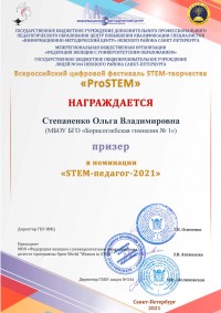 С 24 декабря 2020 по 27 февраля 2021 года прошел Всероссийский цифровой фестиваль STEM-творчества «ProSTEM» в рамках инновационной программы лицея №344 Невского района Санкт-Петербурга «Инвестиции в будущее», целью которой являлась модернизация естественнонаучного образования на основе внедрения STEM-технологии обучения. Организаторы фестиваля: Федеральное государственное бюджетное образовательное учреждение высшего образования «Российский государственный педагогический университет им. А.И. Герцена», Государственное бюджетное учреждение дополнительного профессионального педагогического образования Центр повышения квалификации специалистов «Информационно-методический центр» Невского района Санкт-Петербурга, Государственное бюджетное общеобразовательное учреждение лицей №344 Невского района Санкт-Петербурга. Цель Фестиваля: популяризация и развитие STEM-подхода в образовании. Для участия в конкурсе принимались проекты педагогов и обучающихся, тематика которых не ограничивалась, однако материалы должны были соответствовать идеологии STEM-образования, общепризнанным научным фактам, этическим нормам и законодательству Российской Федерации.