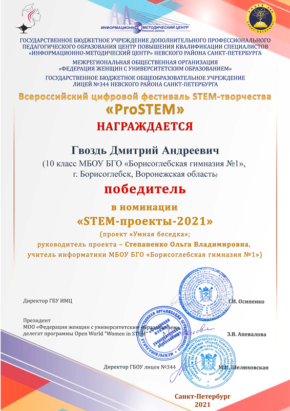 • Победитель – Гвоздь Дмитрий (10 класс), Растяпин Данил (9 «А» класс), Степаненко Алиса (9 «Б» класс), Харченко Олеся (9 «А» класс). Умная беседка (МБОУ БГО «Борисоглебская гимназия № 1», г. Борисоглебск, Воронежская область, руководитель Степаненко О.В.).