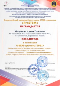• Победитель – Мицкевич Артём (9 «А» класс). Разработка беспилотного летательного аппарата (квадрокоптера) на базе платы Arduino (МБОУ БГО «Борисоглебская гимназия № 1», г. Борисоглебск, Воронежская область, руководитель Степаненко О.В.).