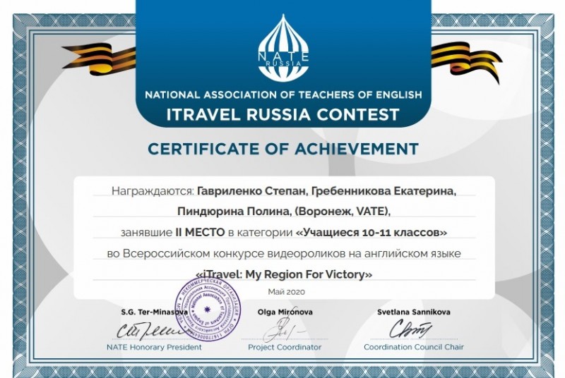 Подведены итоги всероссийского этапа конкурса “iTravel:MyRegionForVictory“, посвященного героическому подвигу советского народа в Великой Отечественной войне и в честь 75-летия Победы в Великой Отечественной войне. В конкурсе приняли участие свыше 500 обучающихся 7-9, 10-11 классов школ, а также студенты средних и высших учебных заведений России. Напоминаем, что на конкурс были отправлены по две лучшие работы в каждой из категорий регионального конкурса. По результатам работы жюри победителями стали: