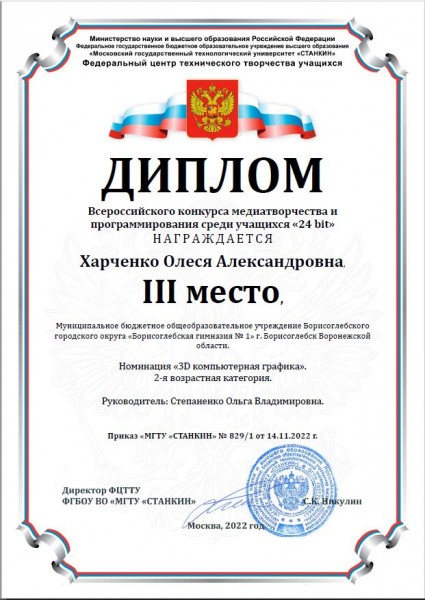 Подведены итоги Всероссийского конкурса медиатворчества и программирования среди учащихся «24 bit» МГТУ "СТАНКИН". Конкурс проведен в рамках проекта «Научно-методическое и организационно-техническое сопровождение участия подведомственных Министерству науки и высшего образования Российской Федерации организаций в формировании Всероссийской экосистемы, обеспечивающей профессиональное самоопределение и развитие научно-технического творчества и инновационной деятельности детей и молодёжи в соответствии с моделями деятельности Кружкового движения Национальной технологической инициативы».