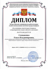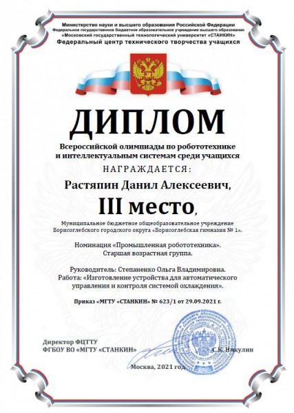 Подведены итоги Всероссийской олимпиады по робототехнике и интеллектуальным системам среди учащихся. Конкурс проведен в соответствии с Планом работы Федерального центра технического творчества учащихся федерального государственного бюджетного образовательного учреждения высшего образования «Московский государственный технологический университет «СТАНКИН» на 2021 год. Конкурс проходил в рамках «Всероссийского открытого фестиваля научно-технического творчества учащихся «Траектория технической мысли-2021» (далее – фестиваль). Фестиваль включен в Приказ Министерства просвещения РФ «Об утверждении перечня олимпиад и иных интеллектуальных и (или) творческих конкурсов, мероприятий, направленных на развитие интеллектуальных и творческих способностей, способностей к занятиям физической культурой и спортом, интереса к научной (научно-исследовательской), инженерно-технической, изобретательской, творческой, физкультурно-спортивной деятельности, а также на пропаганду научных знаний, творческих и спортивных достижений, на 2020/21 учебный год».