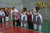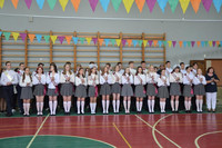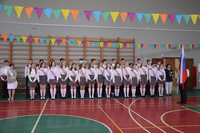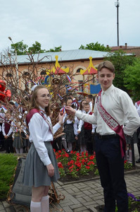 После выпускники 11 класса Недорезова Юлия и Моторин Ростислав повесили колокольчик на дерево мудрости и все вместе, в последний раз, стоя дружным классом у стен родной школы, исполнили гимн гимназии.