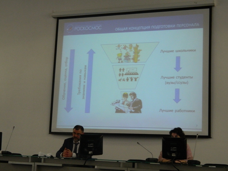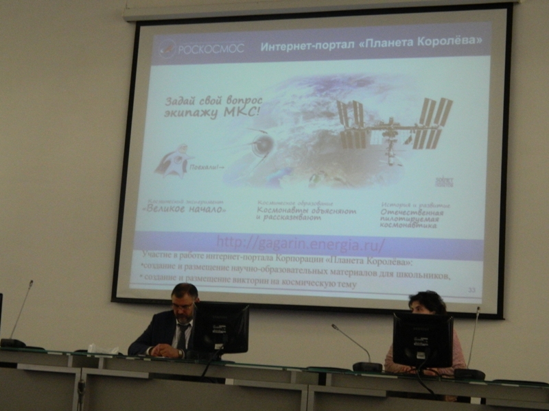 Начальник отдела профориентации Иноземцев Сергей Анатольевич и руководитель направления по проектам в сфере образования департамента развития персонала Басова Вера Петровна познакомили собравшихся с деятельностью госкорпорации «Роскосмос», разработанными курсами и проектами, интересными астрономическими сайтами; рассказали о преимуществах поступления в технические вузы, связанные с космической отраслью, обучающихся, ставших победителями и призёрами различных олимпиад и конкурсов («Звезда», «Шаг в будущее», «Космос», «Роботон МиР», «Евробот» и др.).