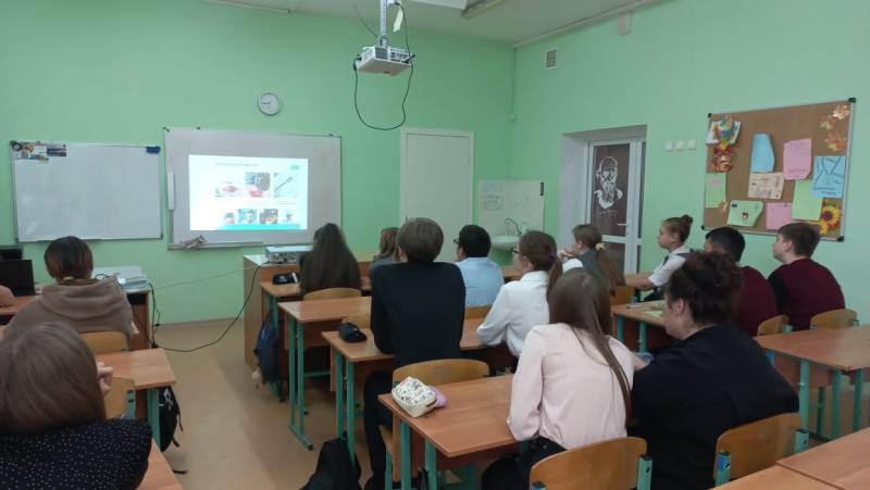 На уроке гимназисты поговорили о том, кем бы они хотели стать в будущем, посмотрели видео, пообщались, выполнили разные задания, рассмотрели профессии из четырех направлений: