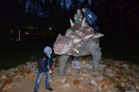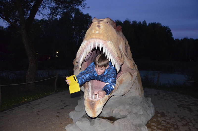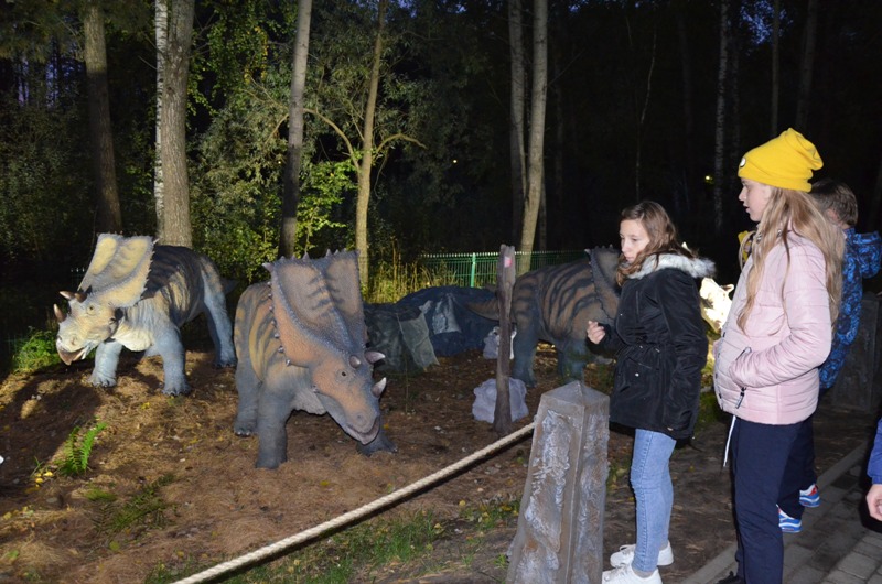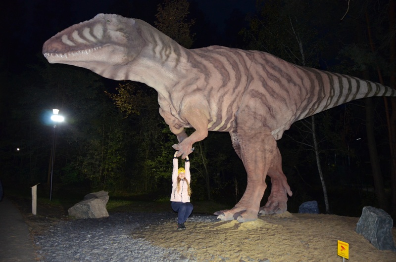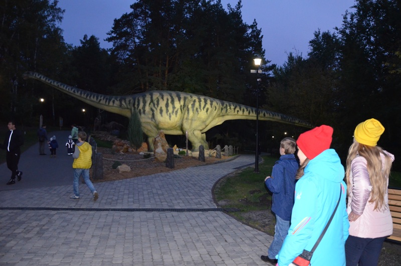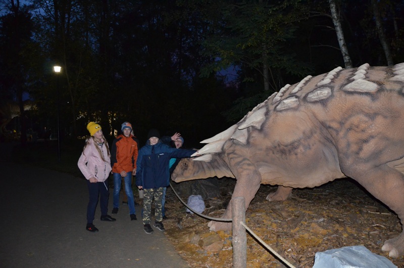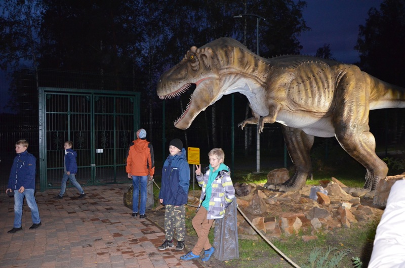 После небольшого отдыха в апартаментах юные робототехники отправились  в недавно открывшийся в 50 м от отеля масштабных размеров Динопарк, который является единственным в России. В нем разместилось 88 фигур динозавров в натуральную величину, некоторые из которых издают звуки, рычат, махают хвостом, щелкают пастью и поворачивают голову, реагируя на датчики движения. Ребята окунулись в прекрасный могучий лес с таинственным озером и трясиной, рассмотрели десятки статических и роботизированных моделей динозавров в натуральную величину, посмотрели фильм в уникальном 3D кинотеатре, побывали в ДиноМузее, и даже смогли поуправлять при помощи джойстика огромным роботизированным динозавром!