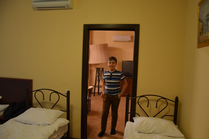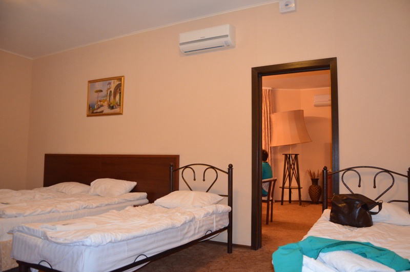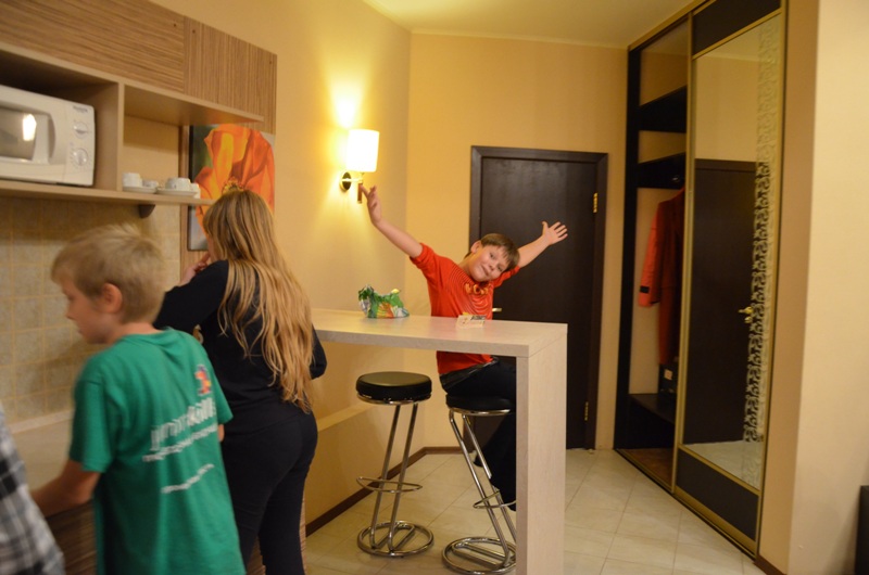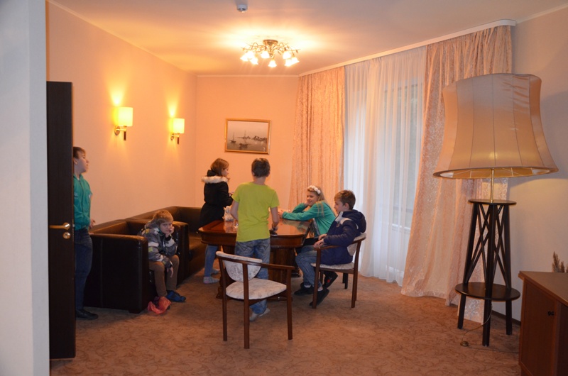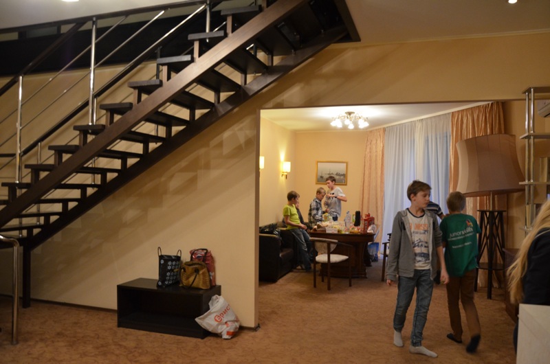 После долгой дороги 7 октября гимназисты заселились в роскошный Парк-отель «ЕВРОПА», который находится в сосновом бору, но при этом с очень развитой инфраструктурой вокруг. Комфортабельный номер VIP класса  - двухэтажные апартаменты общей площадь 180 км метров - порадовал гимназистов своими масштабами и всем необходимым для комфортного отдыха: большая столовая с огромным телевизором, кухня, санузел с ванной, спальня на первом этаже, зона отдыха на втором этаже с огромным столом и телевизором, санузел на втором этаже с душевой кабиной и отдельной сауной, две спальни.