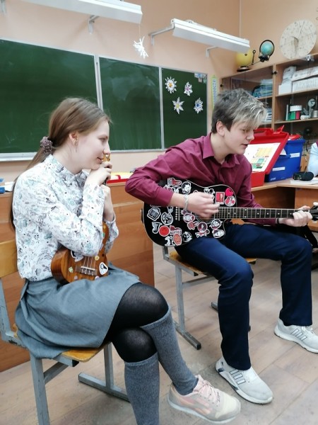 Логическим завершением таких уроков, где обучающими и обучающимися были сами выпускники девятых классов, стало совместное исполнение ими любимых песен под гитару.