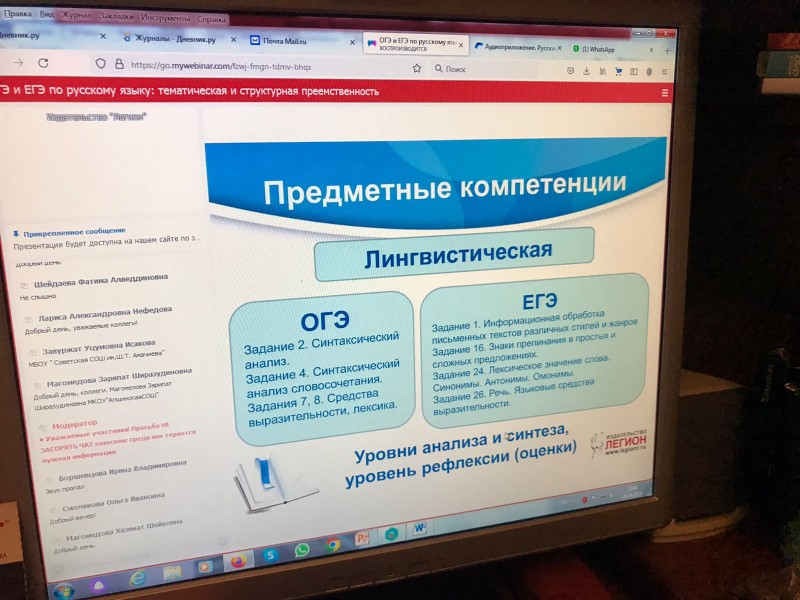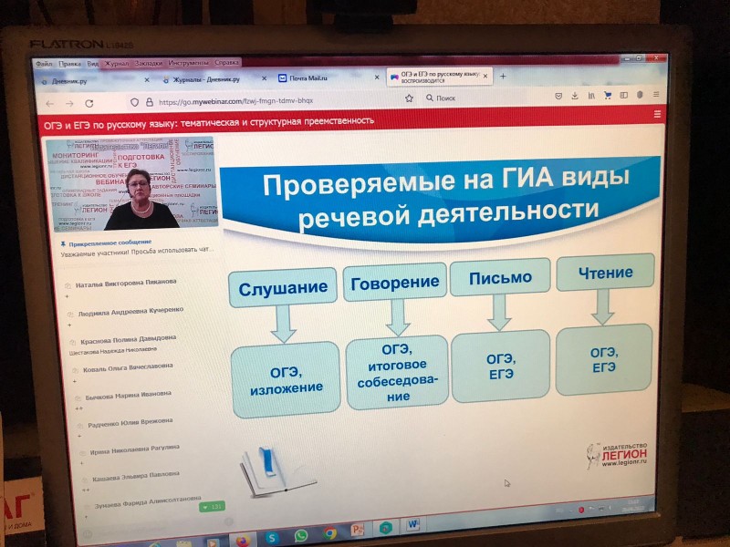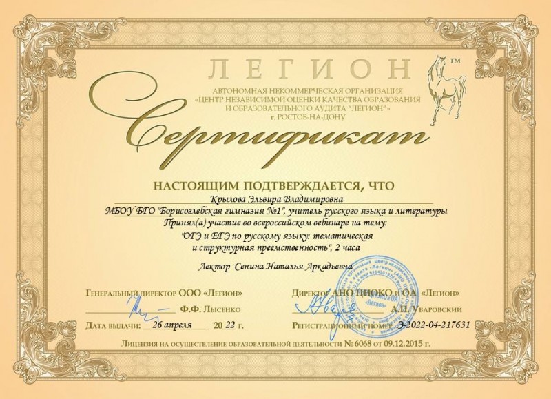 26 апреля 2022г учитель русского языка и литературы МБОУ БГО «Борисоглебская гимназия №1» Крылова Э.В. стала участником вебинара по теме «ОГЭ и ЕГЭ по русскому языку:  тематическая и структурная преемственность», который проводила Сенина Наталья Аркадьевна, кандидат филологических наук, доцент, руководитель отдела русского языка и литературы  издательства «Легион», автор справочников, тренинговых тетрадей и пособий, КИМ для ОГЭ и ЕГЭ по русскому языку.