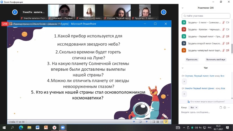 Во время каникул обучающиеся 8 класса (классный руководитель Золотухина Е.И.) Чернышова Алина, Смыслова Таня, Бартенева Алина, Преснякова Даша, Саликова Вика совершили удивительное путешествие по планетам Солнечной системы. 2 ноября 2021 г. девочки в составе команды «Эрудиты» стали участницами онлайн-квеста «ИзвилиУм», организованного Центром «САМ». Пройти онлайн-квест возможно было с помощью смартфона или компьютера на платформе «Zoom». В игре участвовали 5 команд из школ города. Квест состоял из 10 вопросов, перед каждым из которых нужно было разгадать шифр-код. На расшифровку кода команде давалось 25 секунд. Далее на экран выводилось задание, давалась 1 минута на обдумывание ответа, затем в течение 5 секунд выводился правильный ответ.    Все задания были связаны с темой космоса. Игра была очень насыщенной и интересной! Несмотря на проблемы с интернетом, «Эрудиты» заслуженно заняли 1 место! Поздравляем наших девочек!