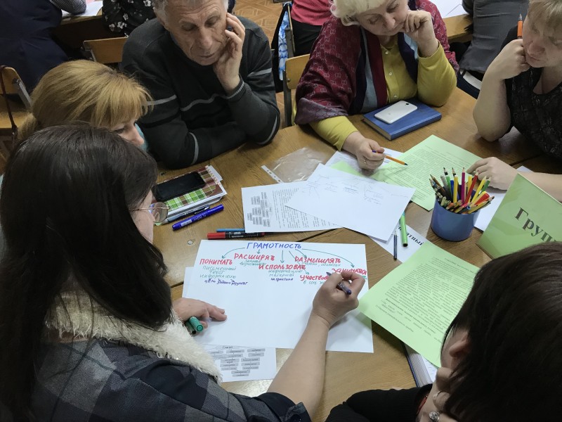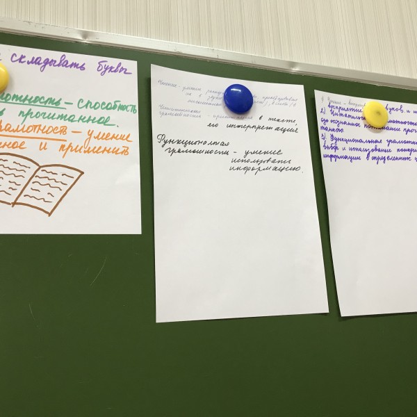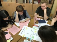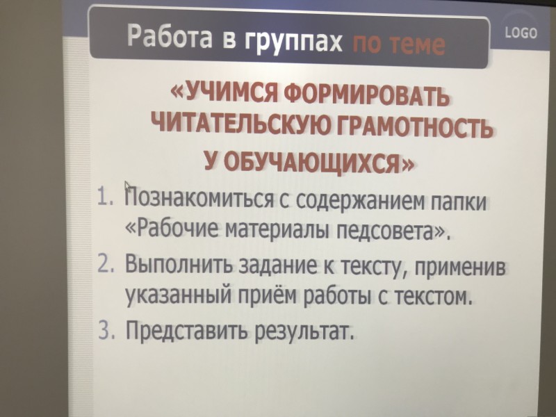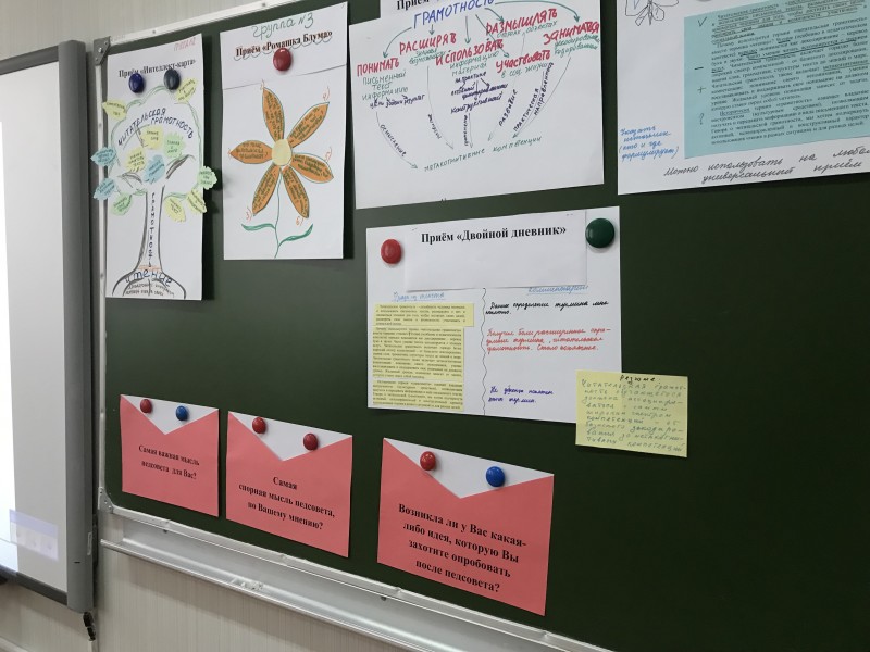 На презентации опыта работы коллеги не остановились! В группах были выполнены в течение педагогического совета 3 практических задания, выполняя которые, педагоги гимназии и коллеги из школ-сетевых партнёров работали с различными текстами (термины, вопросы, собственно тексты), используя разнообразные приёмы. Цель перечисленных выше практик – применение в своей педагогической деятельности приёмов, обеспечивающих понимание текста и создание его читательской интерпретации, обобщение части прочитанного текста, постановка вопросов обобщающего и уточняющего характера и т.п.