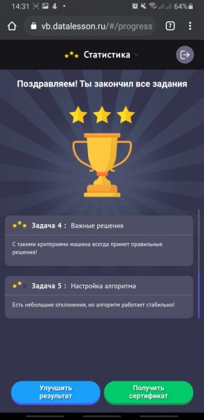 24 сентября 2020 года в 9 "Б" классе и в 11 классе (учитель Степаненко О.В.) прошел урок Цифры на тему "Искусственный интеллект и машинное обучение". На уроке гимназисты прошли все этапы создания алгоритмов искусственного интеллекта на примере беспилотного автомобиля и больше узнали про профессию Data Scientist. Как машины и компьютеры стали умными и начали учиться? Кто им в этом помог? Какие задачи может решать искусственный интеллект сейчас и как он будет выглядеть в далеком будущем? Что вы можете сделать уже сейчас, чтобы развиваться в этой сфере? Ответы на эти вопросы гимназисты узнали из видеолекции к уроку «Искусственный интеллект и машинное обучение». Также ребята попробовали свои силы в игровом тренажере и прошли все этапы карьеры в сфере DataScience и самостоятельно создали алгоритм для беспилотных автомобилей.
