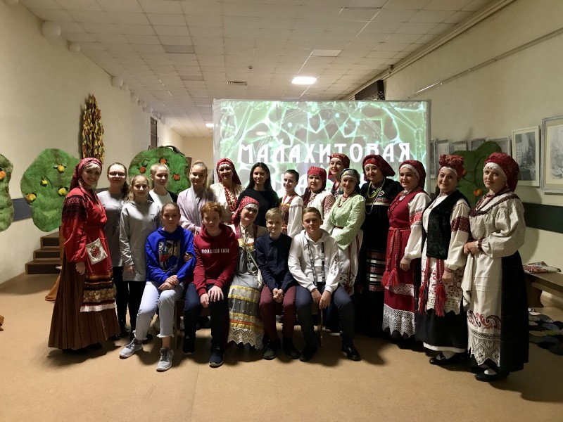 Пришедших в ЦДК обучающихся "Борисоглебской гимназии № 1" (7 класс, классный руководитель Крылова Э.В.) и школ № 4, 9, 10, 13 ожидало настоящее сказочное действо. Трогательное исполнение ансамблем «Ивушка» русских народных песен  как узор на малахитовом камне искусно вплеталось в художественное чтение сказов П.П.Бажова. Гимназисты с удовольствием принимали участие в народных играх, организованных "ивушками"-певуньями в паузах между прослушиванием сказа "Каменный цветок" в исполнении местной сказительницы. Подобные встречи полезны тем, что знакомят подрастающее поколение с русской культурой и её традициями.  Хочется верить, что начало осенних каникул для семиклассников получилось  ярким и запоминающимся!