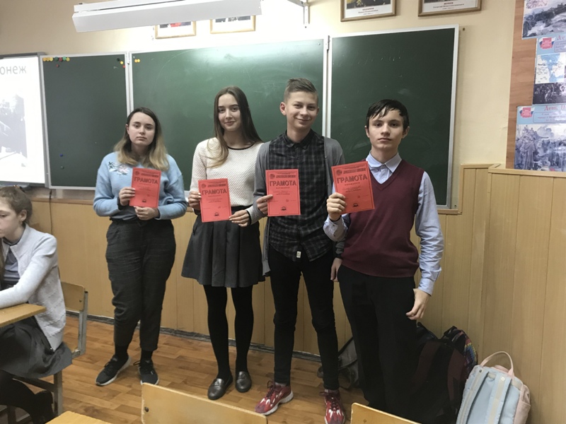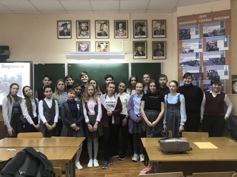 В этот памятный день прошла викторина "Битва за Воронеж, где обучающиеся 6-9 классов объединились в смешанные команды и отвечали на вопросы об истории Воронежа в годы Великой Отечественной Войны. Победила команда в составе 9 кл. ( Пчелинцева Э., Семикин Д., Нелепа В.) и 8 "А" классов ( Харченко О.).