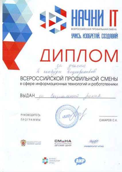 • Диплом за  участие в конкурсе видеороликов Всероссийской профильной смены в сфере информационных технологий и робототехники «Начни IT» за социальный ролик.