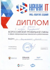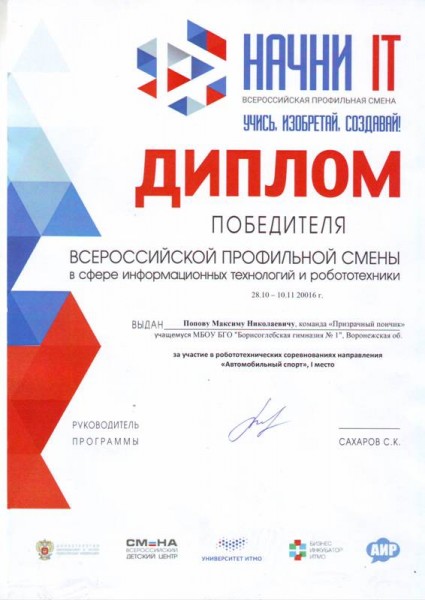 • Диплом победителя Всероссийской профильной смены в сфере информационных технологий и робототехники «Начни IT» за участие в робототехнических соревнованиях направления «Автомобильный спорт» (1 место).