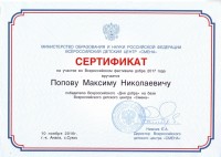 С 28 октября по 10 ноября 2016 г. во Всероссийском детском центре «Смена» (Анапа, п. Сукко) прошла 14-я смена. По итогам конкурсного отбора (копилка достижений по информационным технологиям и робототехнике) в смене  «Начни IT» приняли участие 12 обучающихся Воронежской области. От МБОУ БГО «Борисоглебская гимназия № 1» в смене принял участие Попов Максим, обучающийся 10 класса.