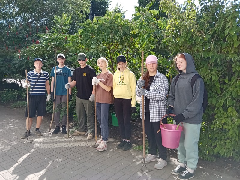 В преддверии нового учебного года волонтёры 10 класса встретились, чтобы придать территории гимназии красивый праздничный вид. Небольшой, но трудолюбивый состав гимназистов поработал на клумбах, на пришкольном участке. В этом году в классном коллективе  есть "новички" - заодно и познакомились! Общее дело сближает, прибавляет энтузиазма, заряжает позитивным настроением. Поэтому и результат налицо: школьный двор стал чище! Десятиклассники поздравляют всех с началом нового учебного года, желают успехов и новых побед!