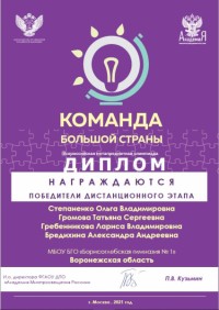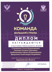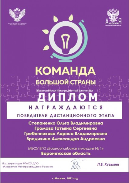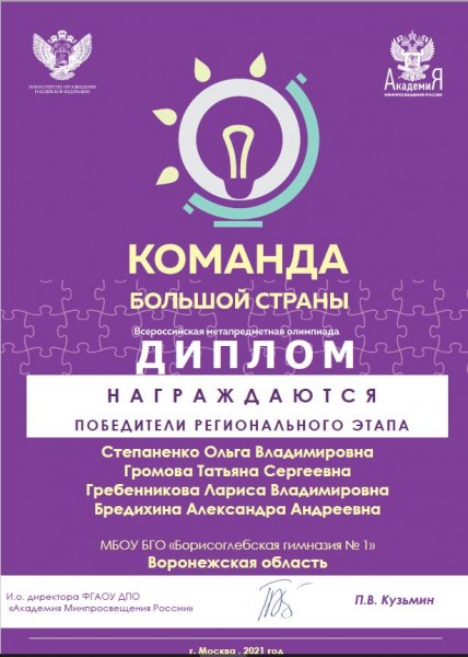 Команда МБОУ БГО «Борисоглебская гимназия № 1» достойно представила Воронежскую область и МБОУ БГО «Борисоглебская гимназия №1» в заключительном этапе Первой Всероссийской метапредметной олимпиады для учителей «Команда большой страны».