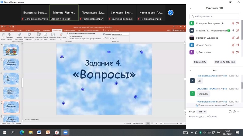 29 декабря 2021 г., в первый день зимних каникул, обучающиеся 8 класса (классный руководитель Золотухина Е.И.) поучаствовали в интеллектуально-развлекательной игре "Зимняя викторина". Ребята виртуально прошли по станциям: "Отгадай загадки", "Ответь на вопросы", "Назови сказку", "Собери пословицы", "Зимний наборщик", "Ёлочные украшения". Викторина была очень весёлой и окунула всех в мир новогоднего волшебства! А что может быть лучше, когда до Нового года осталось совсем чуть-чуть и впереди долгожданные каникулы? Ребята с удовольствием отвечали на вопросы и выполняли задания. Спасибо организаторам за чудесное настроение!